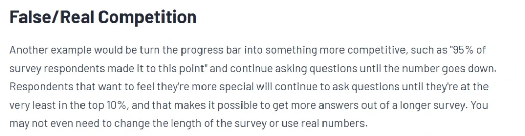 Some survey platforms take it even further. SurveyMethods, in their guide to “gamification,” suggests turning the progress bar into “something more competitive” by telling respondents that “95% of survey respondents made it to this point” as they keep going. They openly admit: “You can simply claim that X amount of participants reached a point… even if no such number exists”.