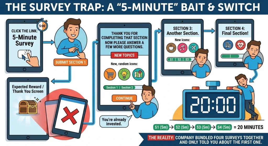What started as a “5-minute survey” just turned into 20 minutes because the company bundled four surveys together and only told you about the first one.