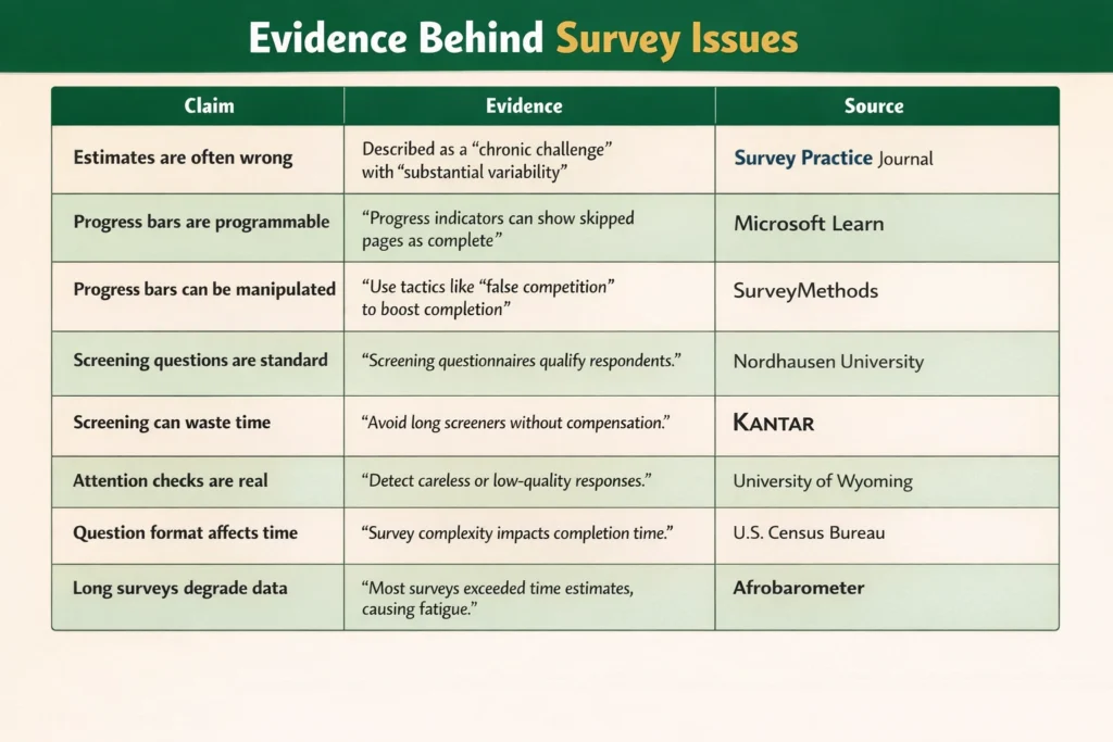 Even when they test these things, the estimates are off. One study tested six different formulas for estimating survey length against a real 133-question survey. The estimates ranged from 7.6 minutes to 39.6 minutes. The actual completion time? 14 minutes